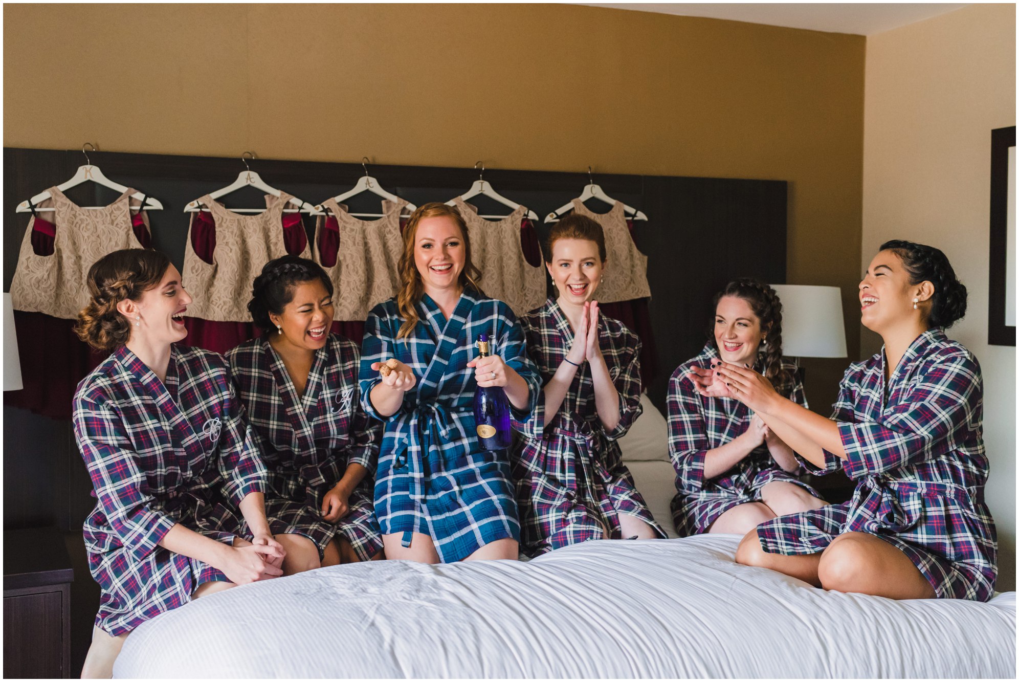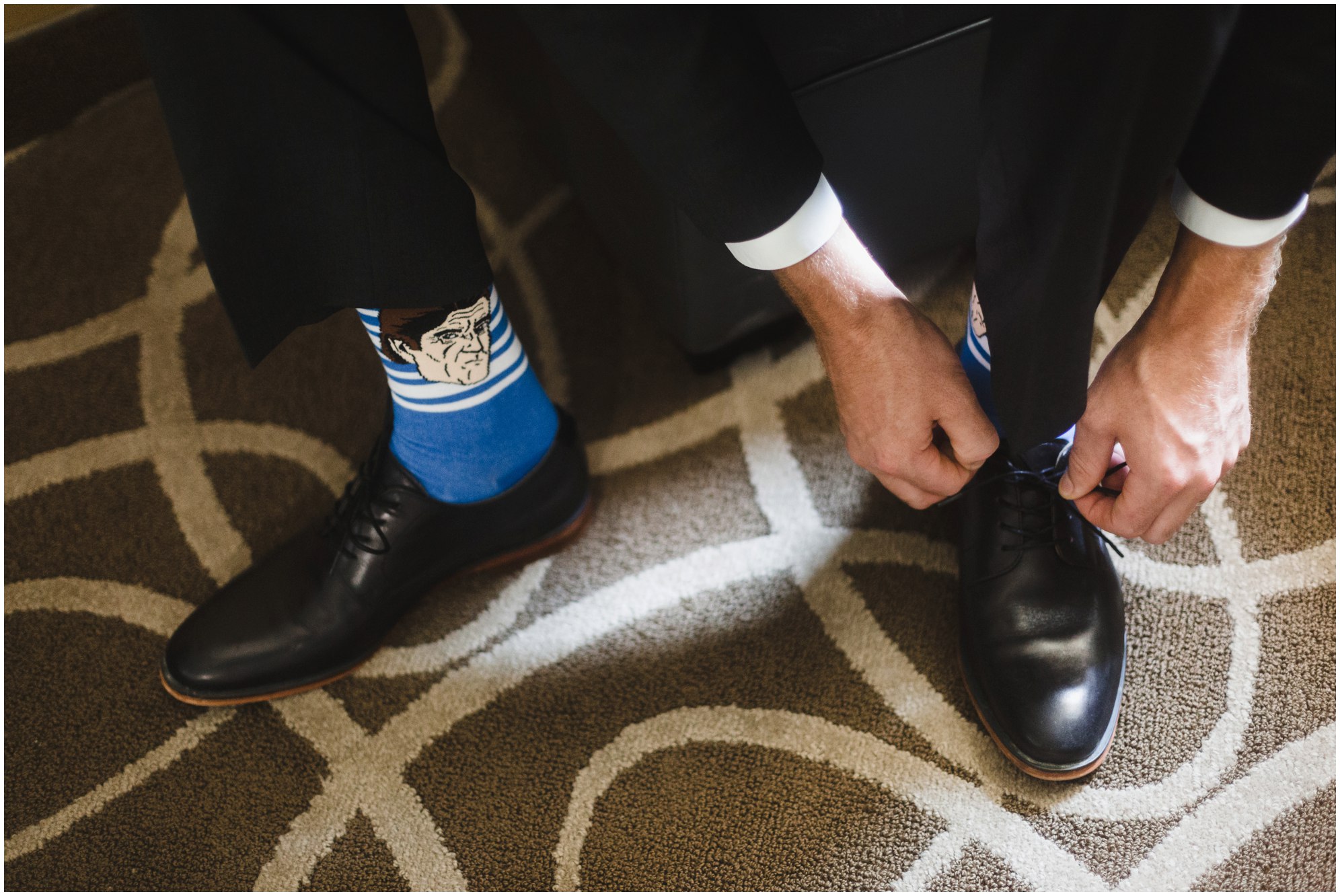 The day began with bride and groom prep at a local hotel. When I arrived, the guys had their full suits on almost an hour before the bridal party finished their hair and make-up. (As per a typical wedding day 😉 ) Joel and his groomsmen, were playfully sporting some very sharp Babsocks (the Leaf’s coach). From these funky socks to the colour of Joel’s pocket square, it was easy to imagine where his hockey allegiances lie.