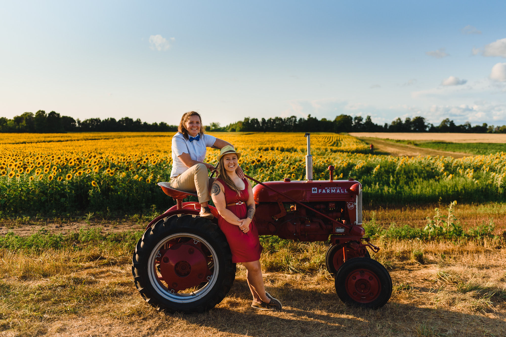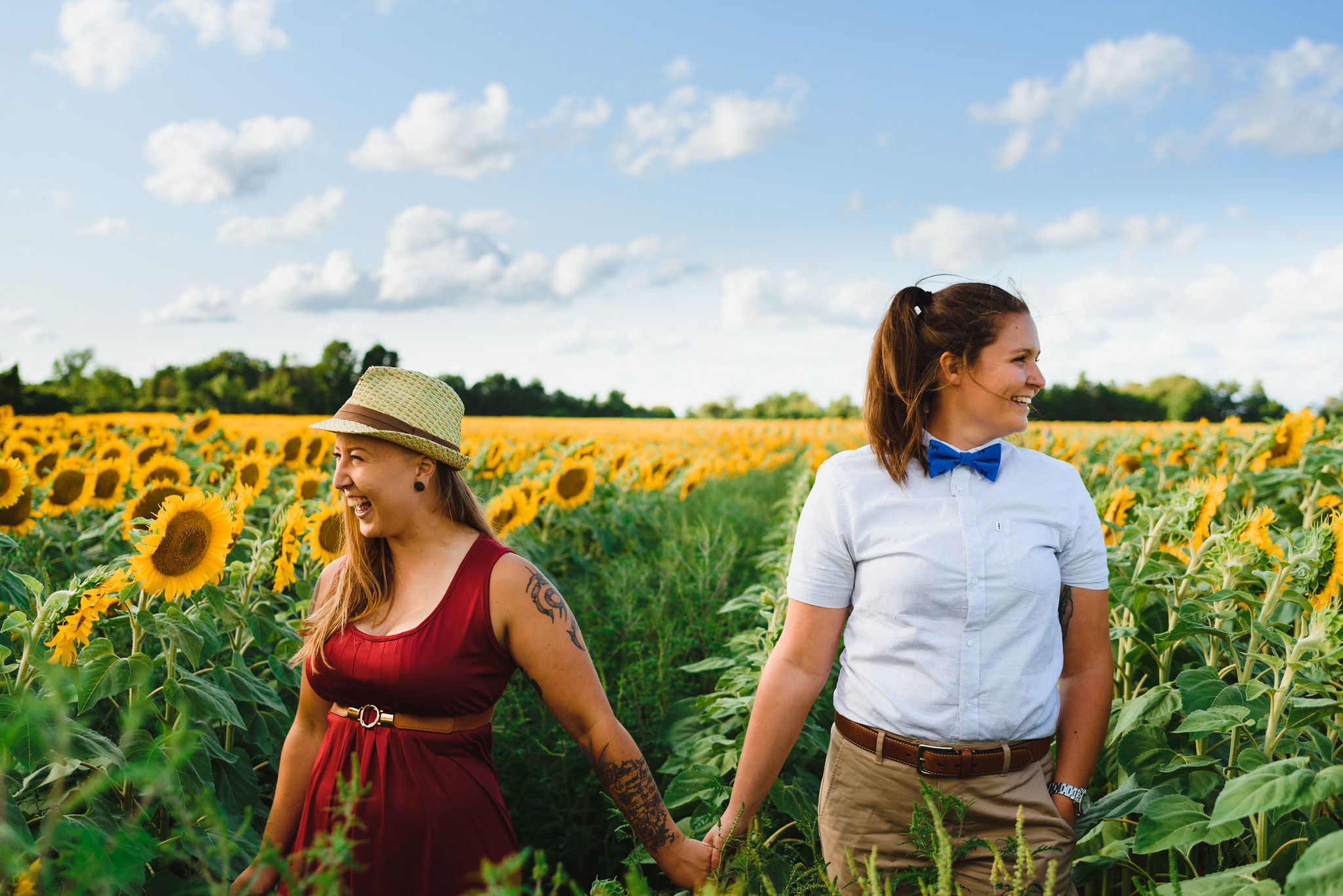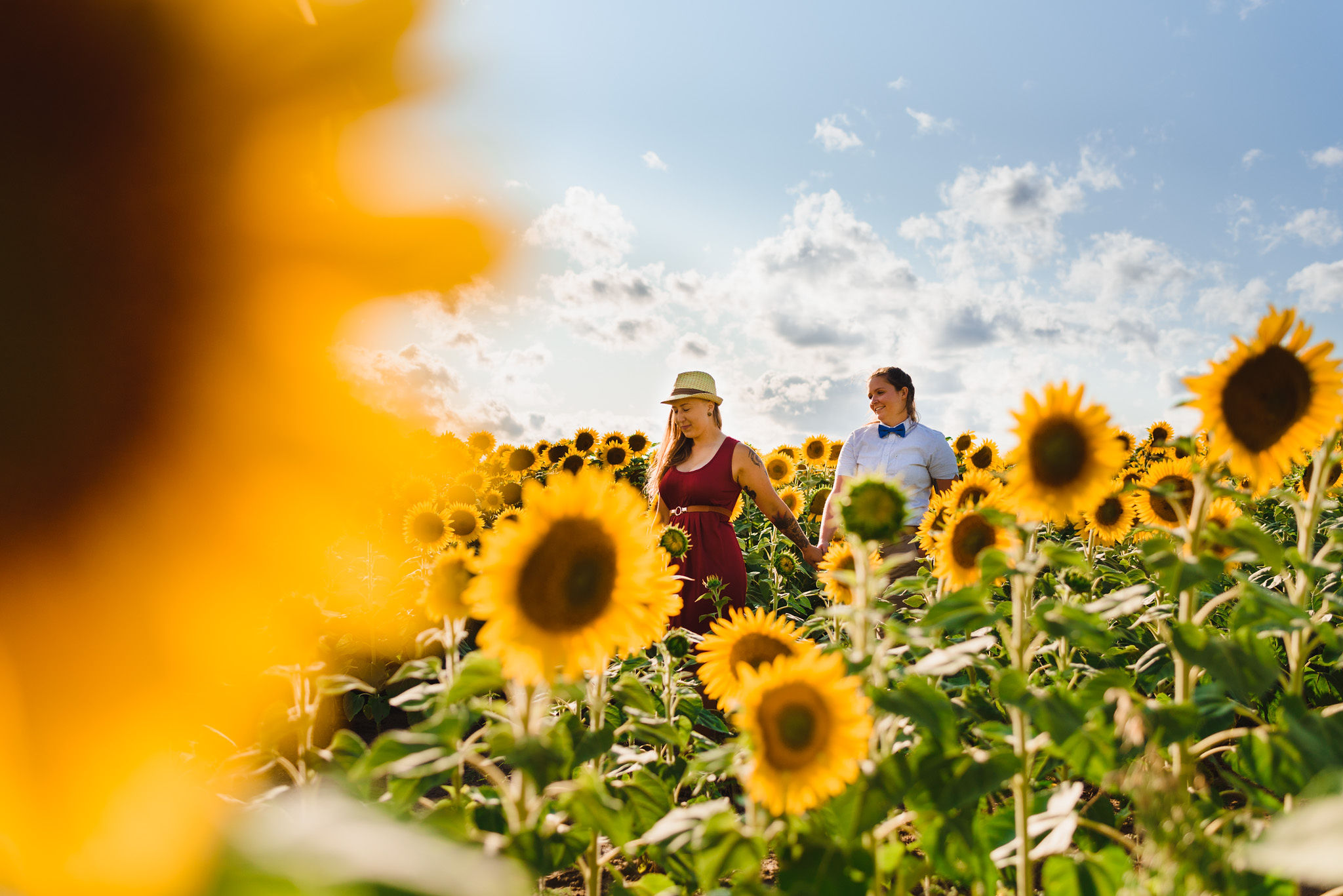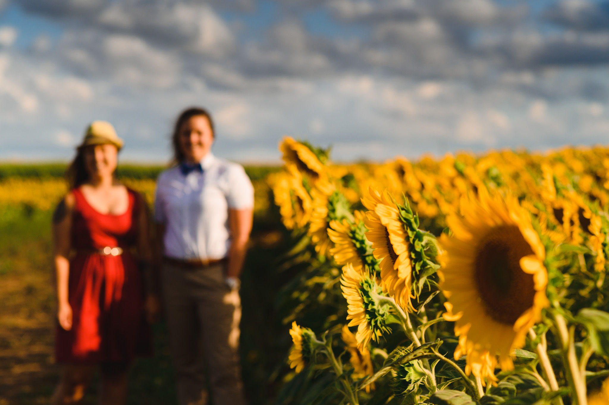 This one is for those sunflower lovers out there. While the season to capture your engagement pictures amongst sunflowers is short, you will not be disappointed with the wait. Their are several great farms around the GTA that have wonderful sunflower fields to shoot your engagement pictures in during the August bloom. One of my favourites is Davis Farm in Caledon East. Not only do they have a very accessible field to roam through, it’s only an hours drive from Toronto. They also have refreshments such as lemonade, ice cream, and booths with fresh veggies and they had a petting zoo with exotic animals. Out in the field they also strategically placed vintage couches so people can capture some very cozy shots among the beautiful sunflowers! Scroll down to check out the engagement shoot I did for Sarah and Justine as they strolled through a beautiful sunflower field.