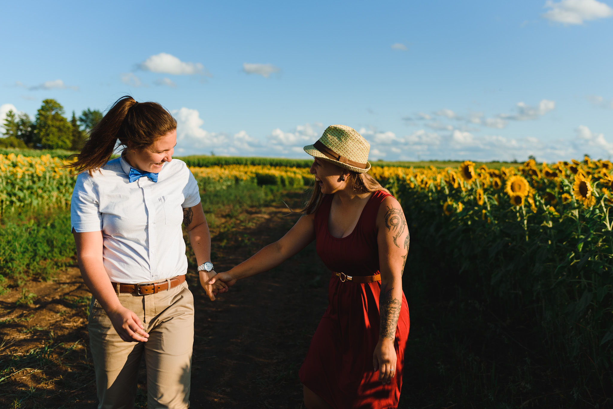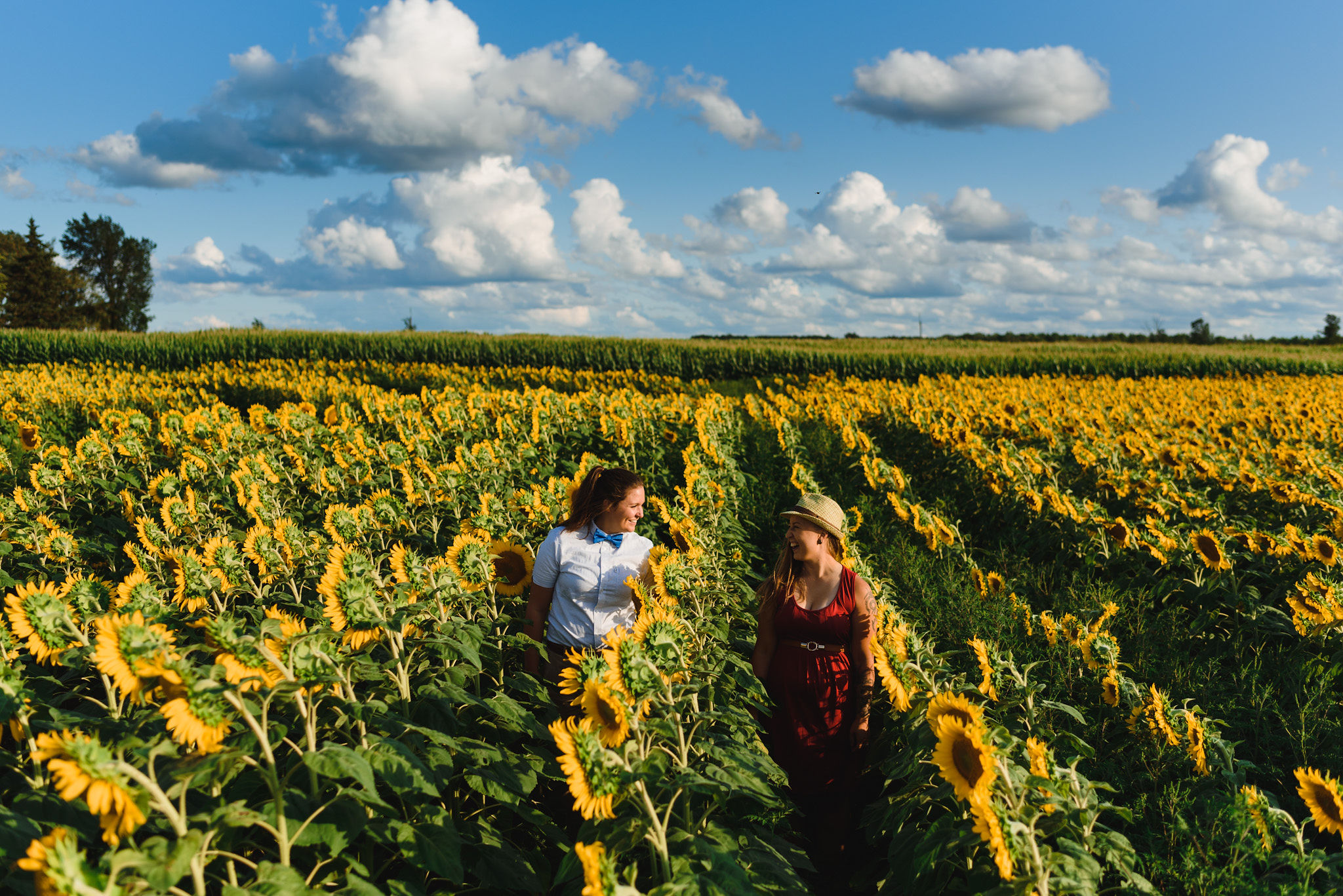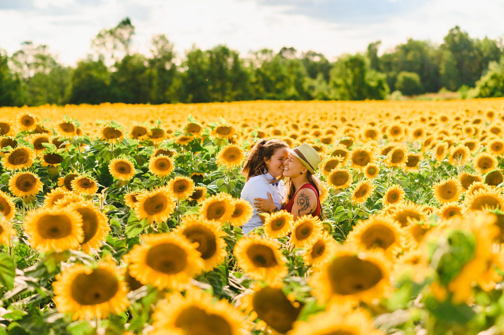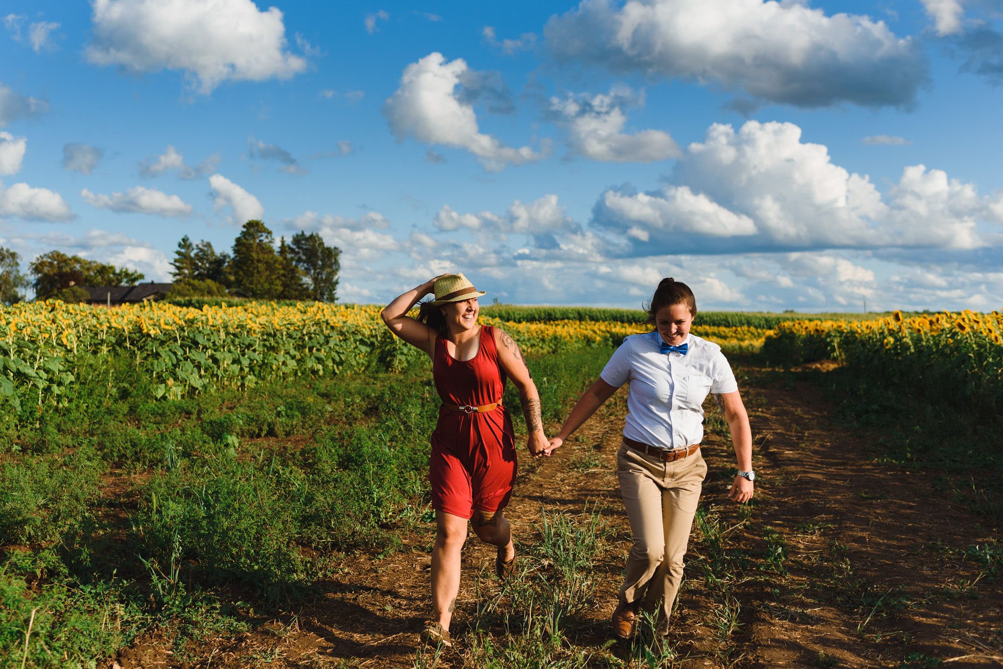 This one is for those sunflower lovers out there. While the season to capture your engagement pictures amongst sunflowers is short, you will not be disappointed with the wait. Their are several great farms around the GTA that have wonderful sunflower fields to shoot your engagement pictures in during the August bloom. One of my favourites is Davis Farm in Caledon East. Not only do they have a very accessible field to roam through, it’s only an hours drive from Toronto. They also have refreshments such as lemonade, ice cream, and booths with fresh veggies and they had a petting zoo with exotic animals. Out in the field they also strategically placed vintage couches so people can capture some very cozy shots among the beautiful sunflowers! Scroll down to check out the engagement shoot I did for Sarah and Justine as they strolled through a beautiful sunflower field.
