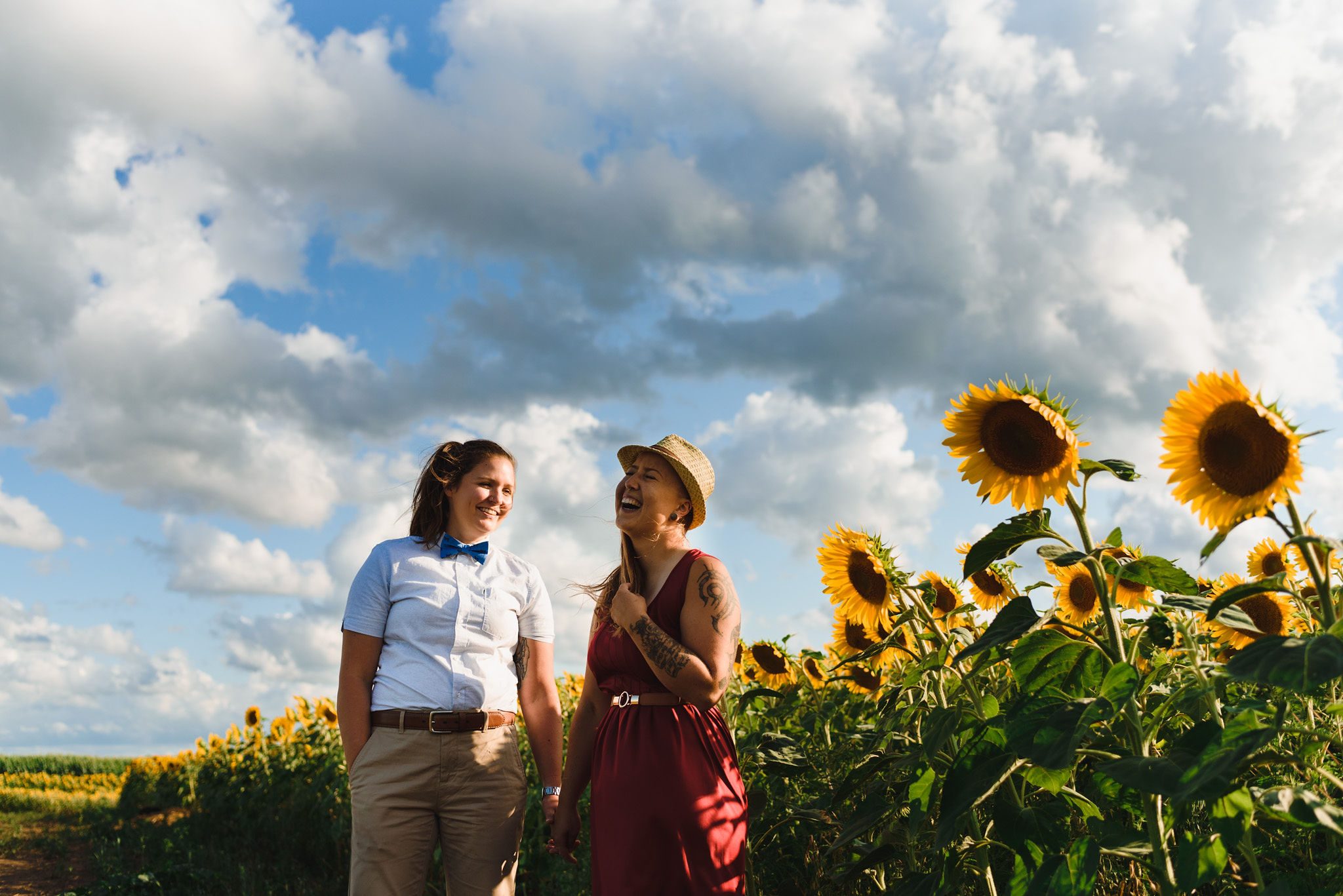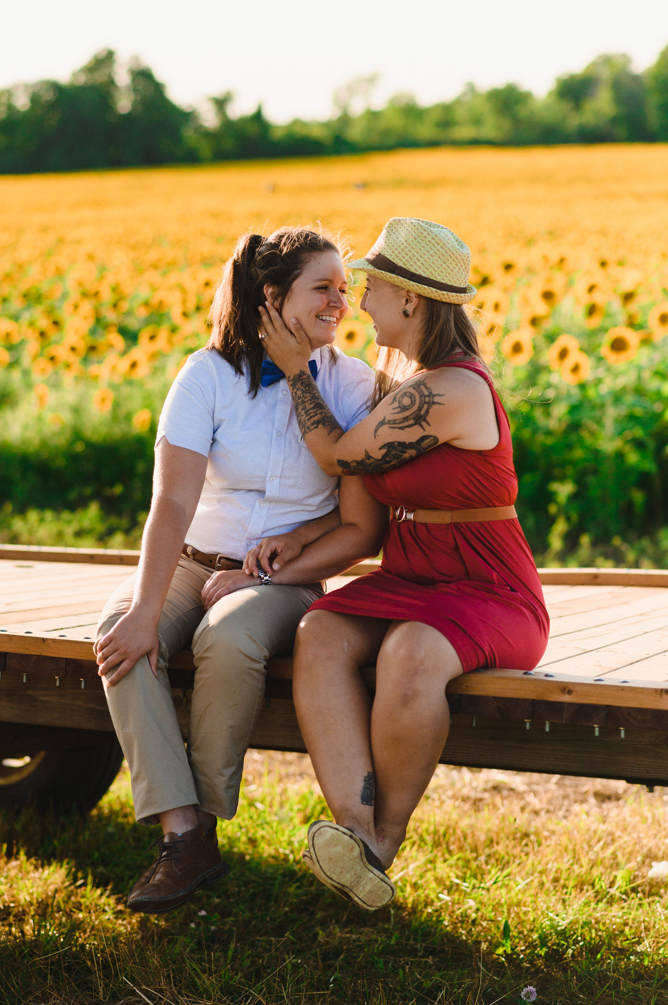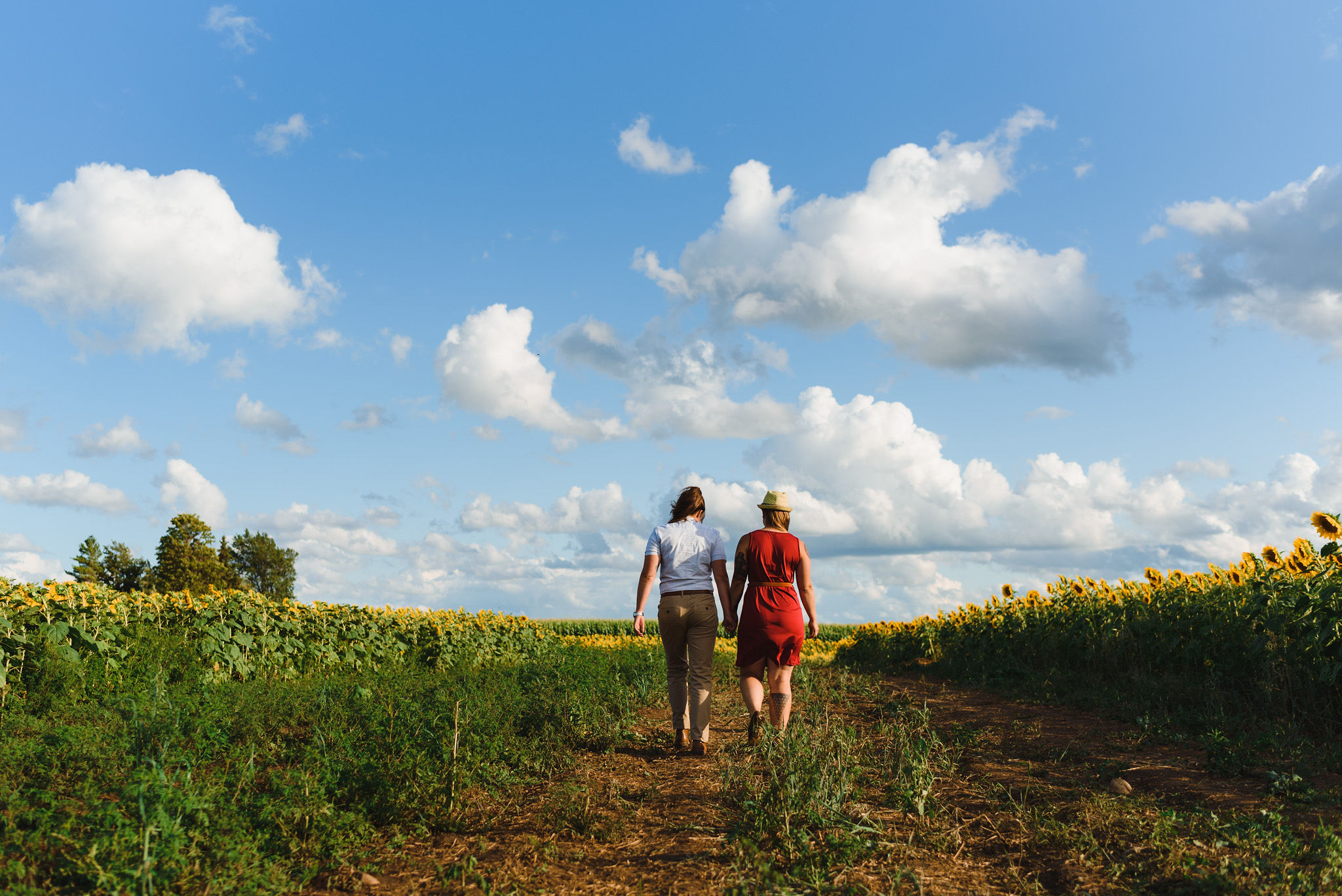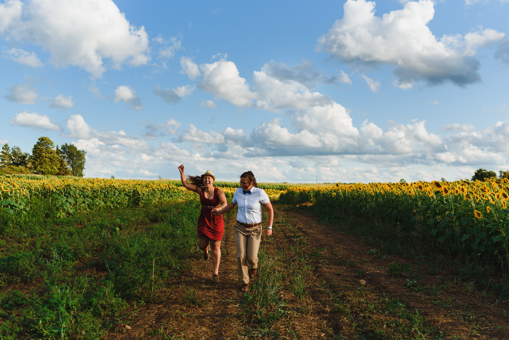 This one is for those sunflower lovers out there. While the season to capture your engagement pictures amongst sunflowers is short, you will not be disappointed with the wait. Their are several great farms around the GTA that have wonderful sunflower fields to shoot your engagement pictures in during the August bloom. One of my favourites is Davis Farm in Caledon East. Not only do they have a very accessible field to roam through, it’s only an hours drive from Toronto. They also have refreshments such as lemonade, ice cream, and booths with fresh veggies and they had a petting zoo with exotic animals. Out in the field they also strategically placed vintage couches so people can capture some very cozy shots among the beautiful sunflowers! Scroll down to check out the engagement shoot I did for Sarah and Justine as they strolled through a beautiful sunflower field.