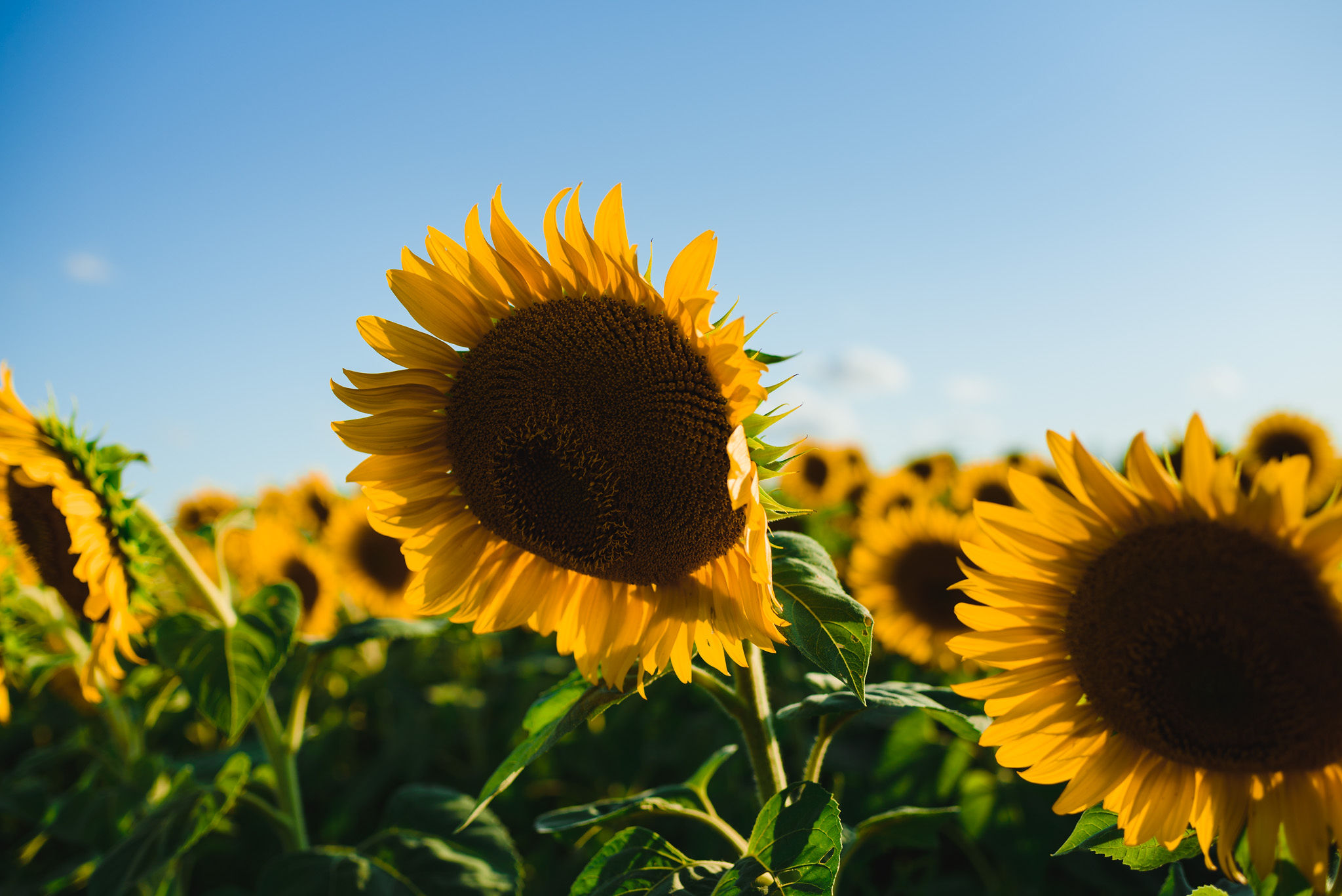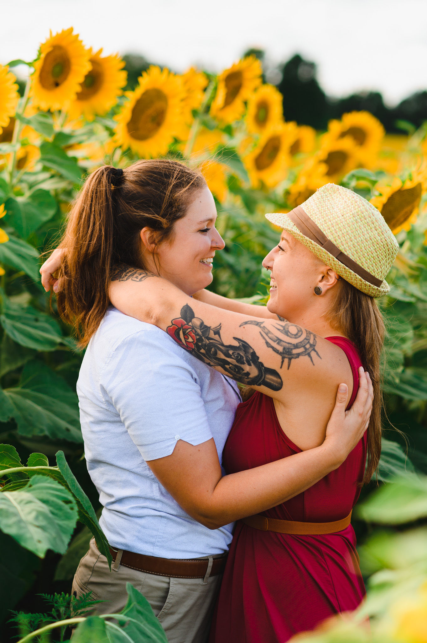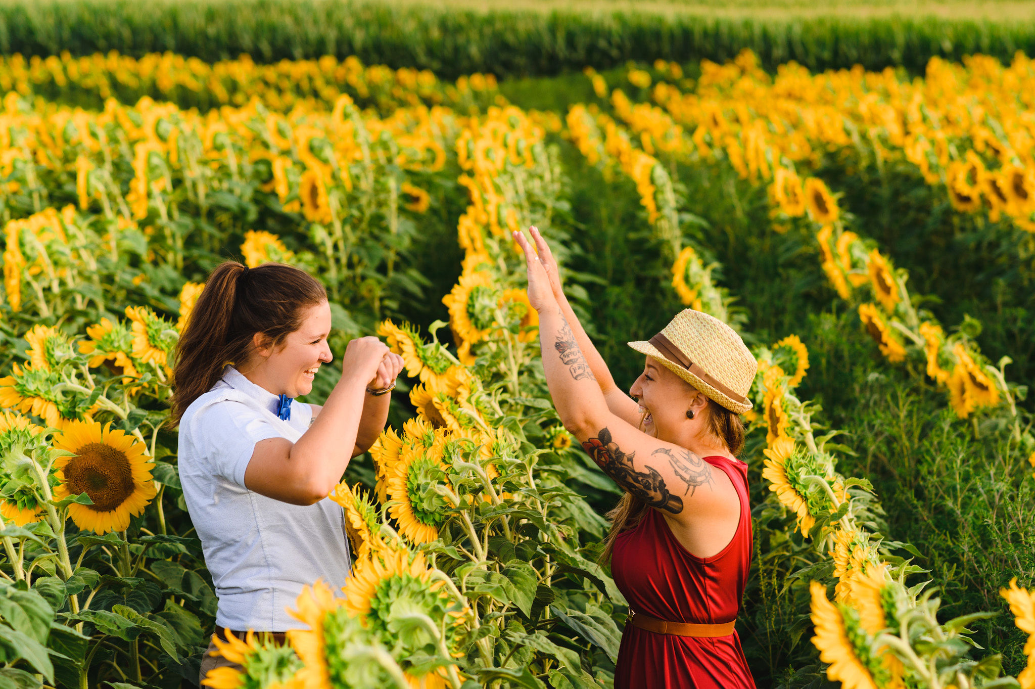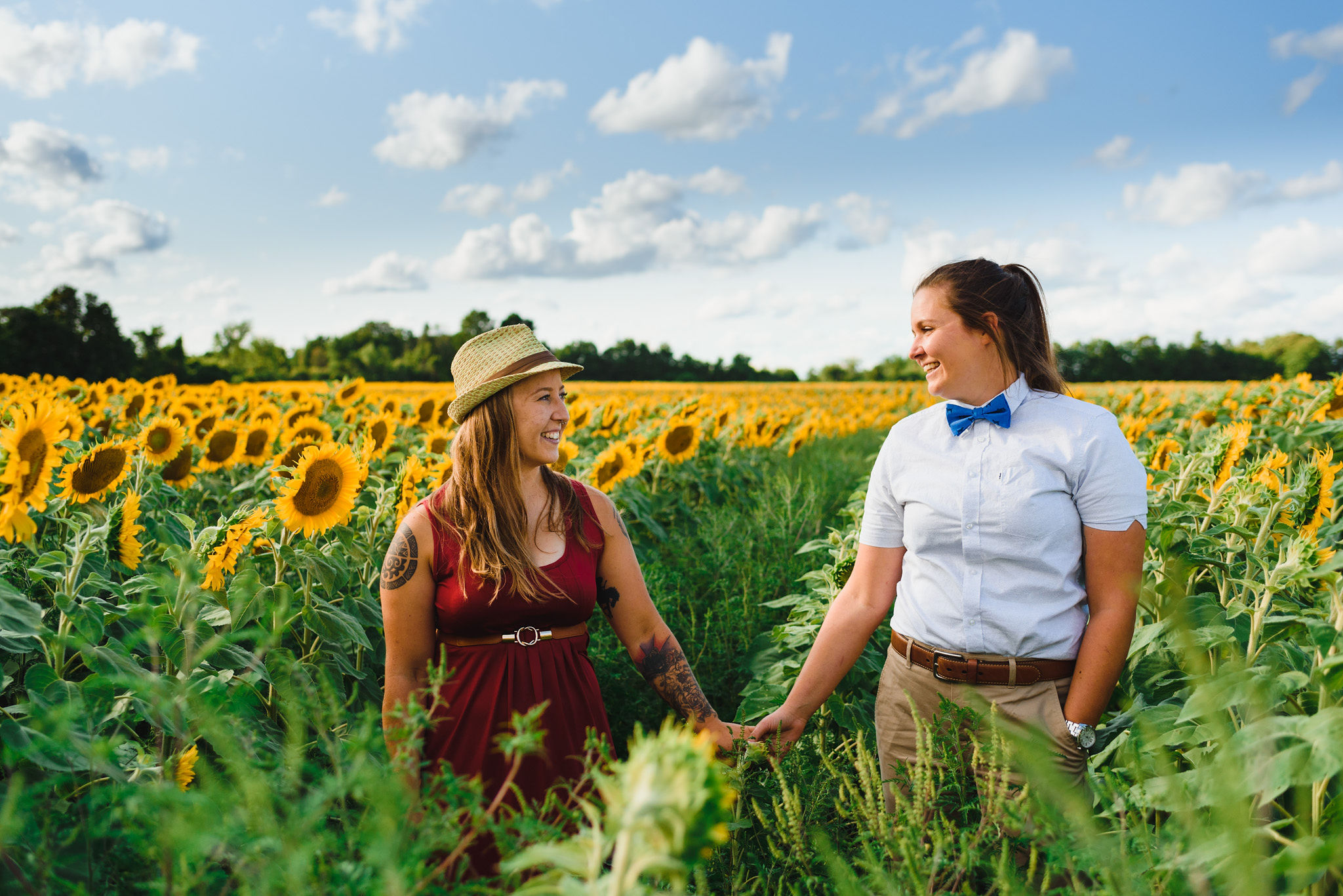 This one is for those sunflower lovers out there. While the season to capture your engagement pictures amongst sunflowers is short, you will not be disappointed with the wait. Their are several great farms around the GTA that have wonderful sunflower fields to shoot your engagement pictures in during the August bloom. One of my favourites is Davis Farm in Caledon East. Not only do they have a very accessible field to roam through, it’s only an hours drive from Toronto. They also have refreshments such as lemonade, ice cream, and booths with fresh veggies and they had a petting zoo with exotic animals. Out in the field they also strategically placed vintage couches so people can capture some very cozy shots among the beautiful sunflowers! Scroll down to check out the engagement shoot I did for Sarah and Justine as they strolled through a beautiful sunflower field.